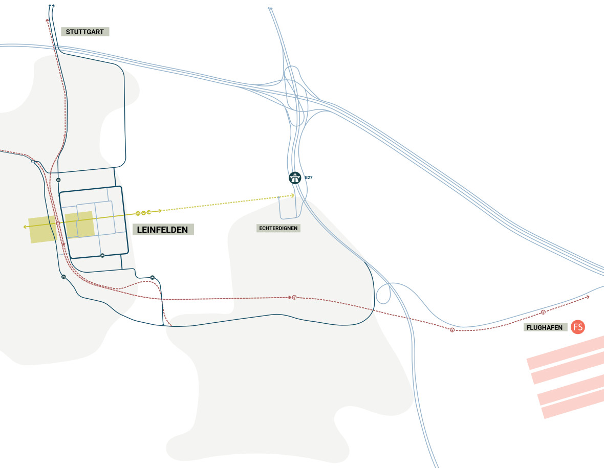 The new key connections are central to the concept. These connections include the integrated North Link and a prominent axis from the marketplace and town hall to the surrounding Filder landscape. This axis forms the backbone of the urban network and helps the city feel more connected to its natural surroundings, while the Leinfelden–Echterdingen connection further enhances this network by prioritizing ‘soft mobility’ alongside its excellent links to the B27 and the airport.