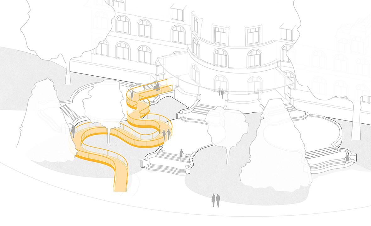 The area around the Neo-Baroque service building will be refurbished while taking aspects of monument care into account. A sculptural ramp is a contemporary addition providing access to the building for the disabled.