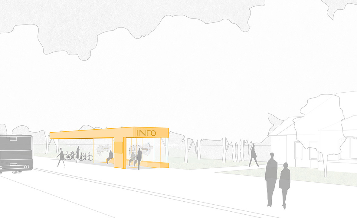A concrete and glass pavilion offers orientation and information about the cemetery and functions as a bus stop for bus lines at the cemetery. The pavilion will be the first of a network of pavilions located at strategic locations linked to the road network and the bus network throughout the cemetery.