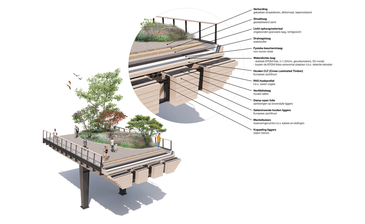 The bridge aligns seamlessly with the sustainability ambitions of clients ProRail and the Municipality of Zwolle. By opting for a defining wooden structure, the CO₂ emissions are 74% lower than those of a comparable steel bridge. These pioneering design choices required smart technical solutions, particularly in relation to water management and the planting on the bridge. The successful realisation demonstrates that sustainable innovation and architectural quality can go hand in hand.