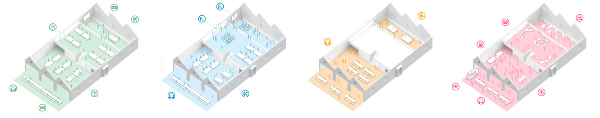 Meeting rooms, kitchen, and archive are combined into one compact cubic content. The way we positioned the content in the hall ensures that it’s surrounded by multi-purpose spaces of various sizes and orientations. The use defines the space, so we can always find the place that’s best-suited to requirements or the time of day: whether we need somewhere with the character of studio, attic, living room, workshop, auditorium, or exhibition space.