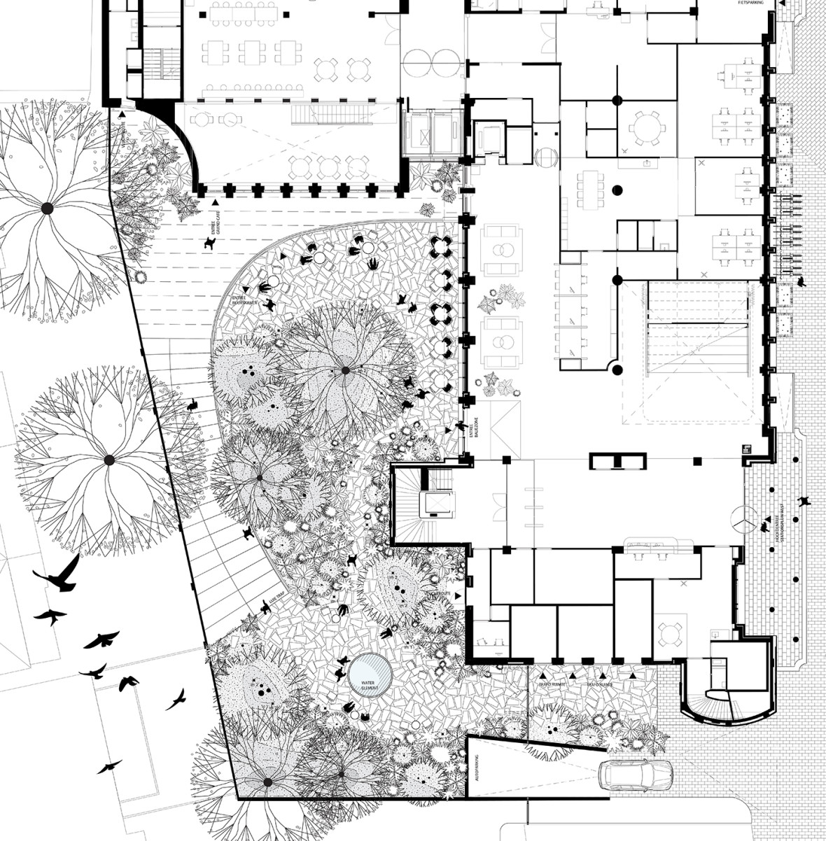 The Government Office itself will boast a rich combination of green rooftops and a public courtyard, which will form a green oasis for residents, passersby and employees. The publicly accessible inner courtyards in the urban block will form the main thoroughfare between the entrance, which is situated 6 metres higher, and the railway station, whose ticket booths can be accessed from Stationsplein West. The ambiance of the courtyard is based on the properties of the surrounding landscape of the outer edges of the Veluwe National Park. A cohesive look is created by means of plants carefully selected for their effect, looks and biodiversity, as well as sustainable water management and recycled or recyclable materials.