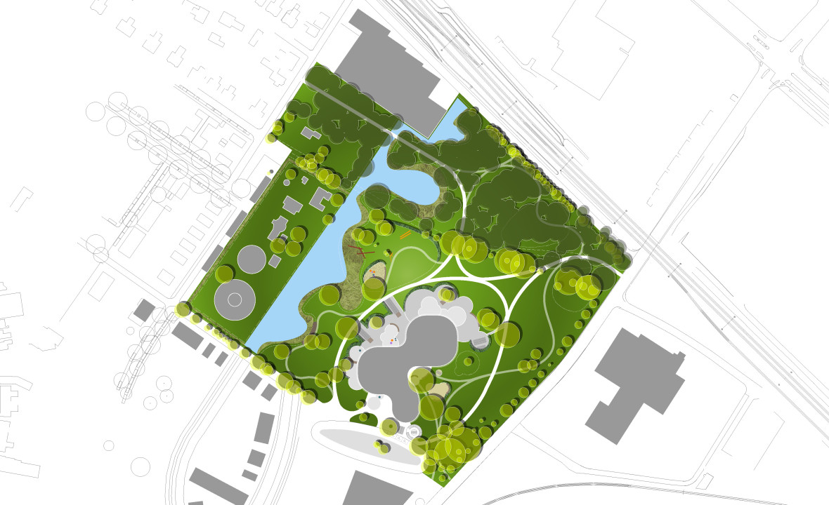The park programme is ambitious and can be seen through the points outlined below. It should be a park for everyone, with a better connection to the city, safer transport connections and space for new activities such as play and discovery. At the same time there is a solid building programme for Multifunctional Accomodation (a combination of schools, child daycare, etc.), with associated outdoor spaces such as a playground, water storage, maintenance of the wetland forest and a new purpose for the water tower and remaining monuments. For a park with a total scope of 6.5 hectares it is no simple task.